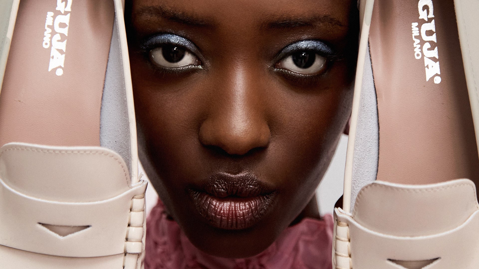 Ballerina in astrakan color cuoio con cinturino e occhielli metallici