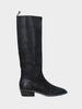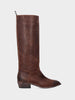 Realizzato in vitello testa di moro, questo camperos a stivale presenta una punta sfilata e un gambale a tubo, dalla forma classica e slanciata. Il tacco largo da 40mm, fasciato in cuoio, conferisce equilibrio e stabilità, mentre la suola in cuoio lavato dona al modello un fascino autentico e vissuto, tipico delle lavorazioni artigianali. Le proporzioni armoniose e la linea essenziale rendono questo stivale una scelta perfetta per chi desidera un'eleganza senza tempo con un accento contemporaneo.