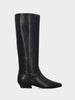 Realizzato in vitello nero, presenta una punta quadratina e un tacco basso a coda da 20mm, che dona slancio mantenendo una calzata comoda e stabile. Il gambale liscio a tubo esalta la silhouette verticale dello stivale, mentre la suola in cuoio sottolinea la qualità artigianale e dona raffinatezza alla struttura.