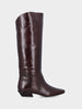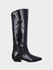 Realizzato in vitello nero, presenta una punta quadratina e un tacco a blocco da 25mm che assicura stabilità e comodità. Il gambale a tubo con apertura svasata sul polpaccio dona carattere e slancio alla silhouette, mentre la suola in gomma garantisce resistenza e comfort.