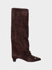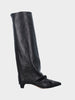 Realizzato in nappa nera, presenta una punta sfilata che slancia la silhouette e un tacco a coda da 40mm che offre equilibrio tra eleganza e comfort. Il gambale risvoltato fino alla pianta, impreziosito da un cinturino finale, crea un effetto dinamico e sofisticato che valorizza la linea della gamba. La suola in gomma assicura praticità e aderenza, rendendo questo modello ideale per la città e le mezze stagioni.